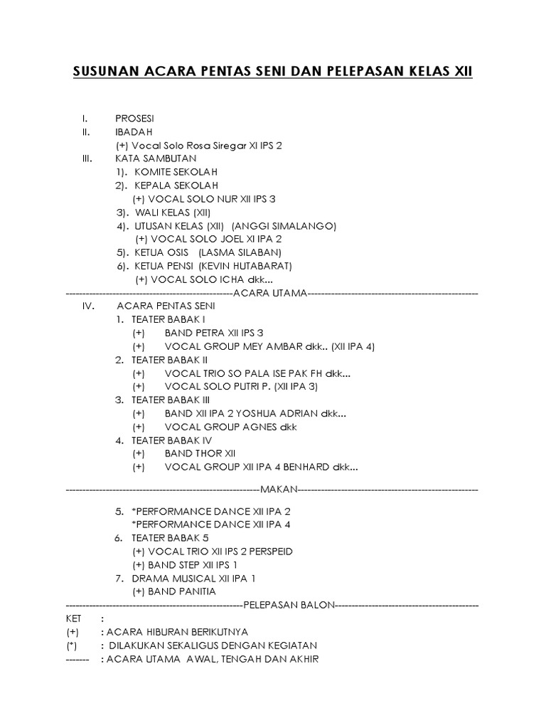 Contoh Susunan Panitia Pensi Pentas Seni Kelas XI IPS 2 SMA 1 Karanganyar Solo. Talent Vocal Grub gabungan antar kelas XII IPA dengan kelas IPS Talent. Pukul 1600 WITA 1830 WITA Tempat.